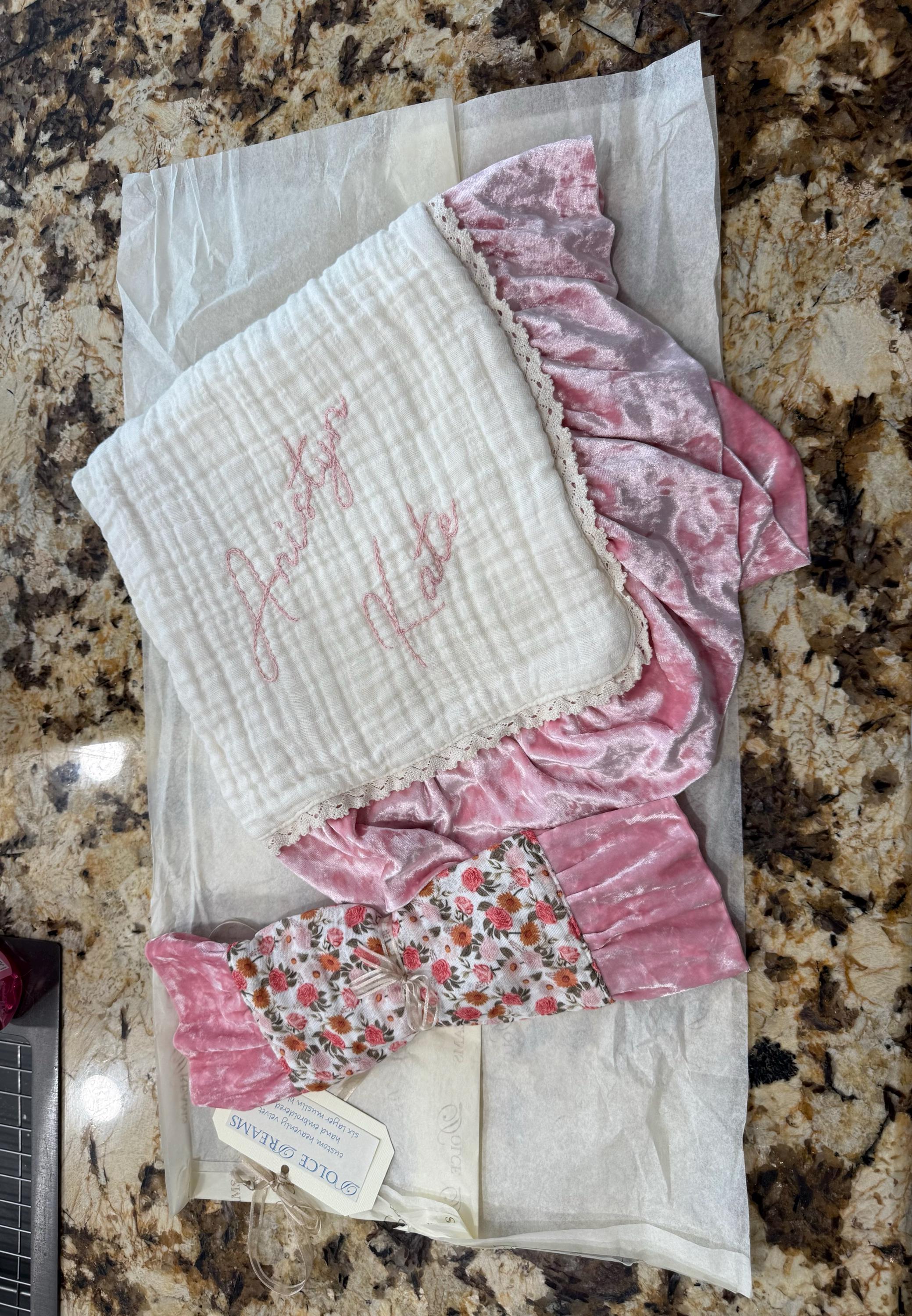 I ordered the 36x36 blanket with the Iced Pink velvet trim and could not be more pleased! It is absolutely stunning!! Beautiful craftsmanship and Nathalie was very communicative and easy to work with. It’s an heirloom piece that we’ll be keeping forever.